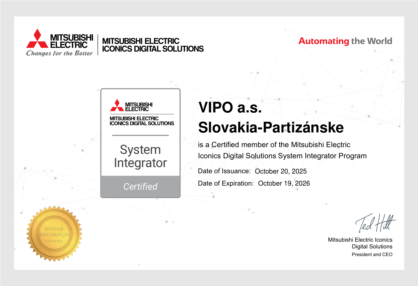 VIPO a.s. je certifikovaným členom programu Mitsubishi Electric Iconics Digital Solutions System Integrator